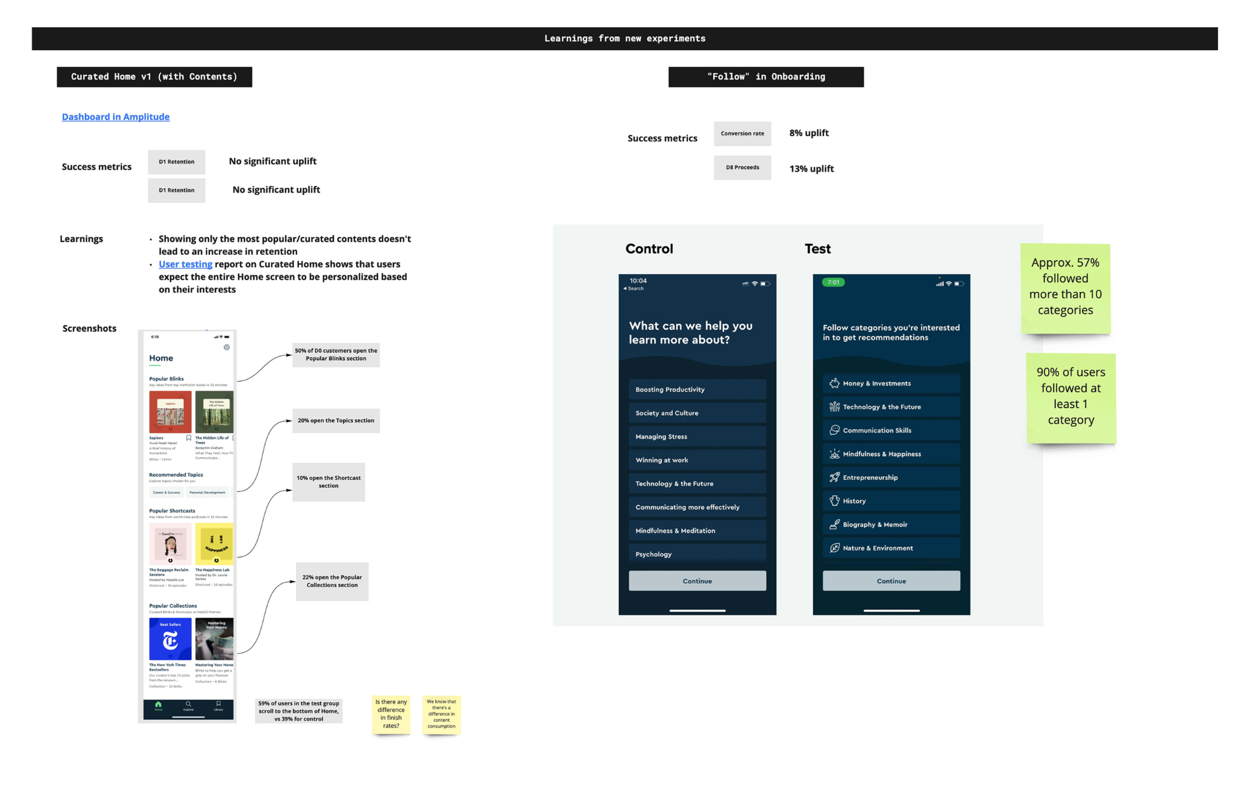 Our hypothesis was that customizing the Home screen with pre-selected categories from onboarding would increase week 1 retention, boost content interaction on D0 and enhance content consumption on D1.