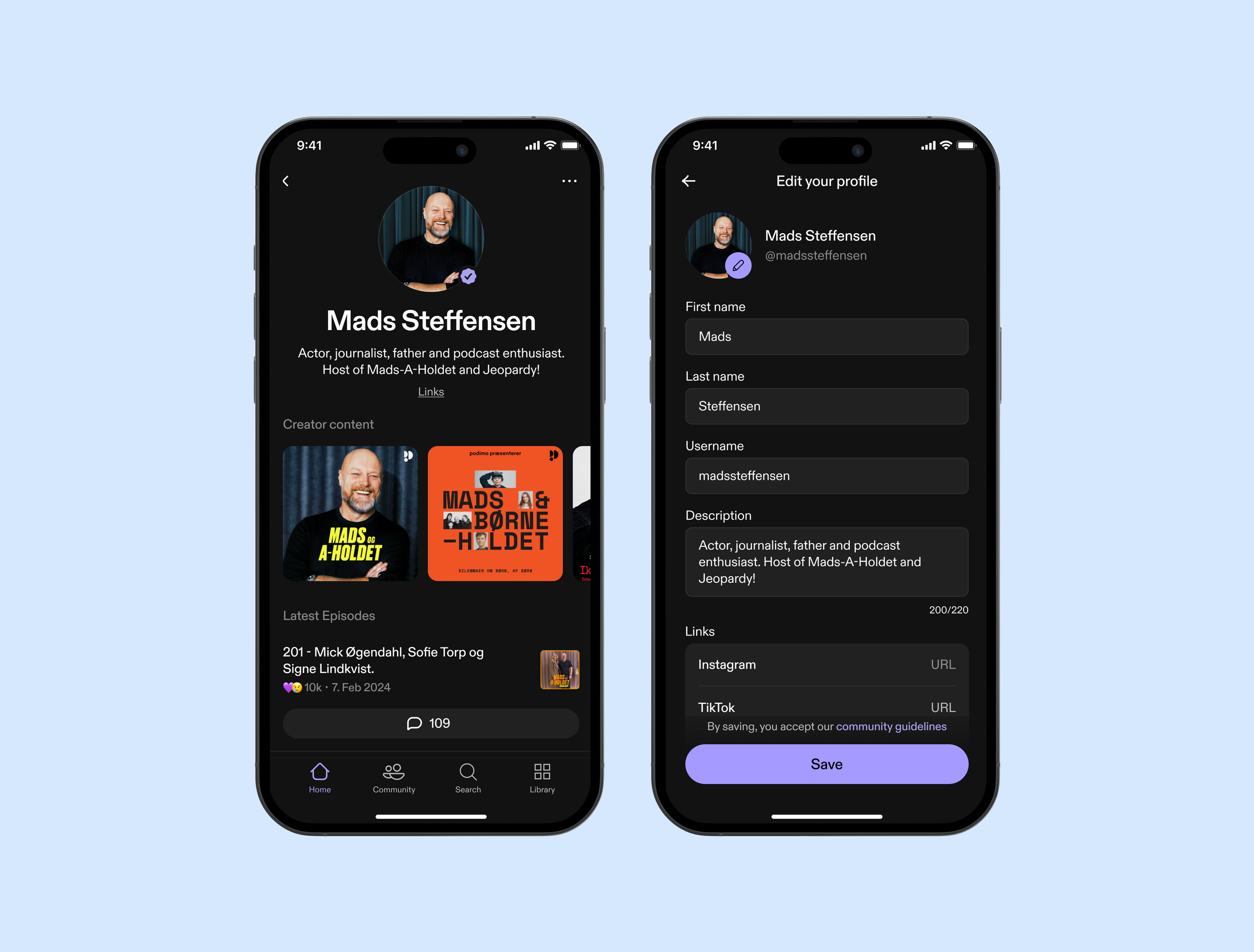 Off-platform “community” moments were scattered, so I designed a show-anchored feed inside the listening journey. Creators can share teasers, clips, and updates in one tap; fans stay in Podimo where discovery converts to listens. We added simple ranking (followed shows + freshness) and a single + entry point—turning passive followers into active, returning listeners.